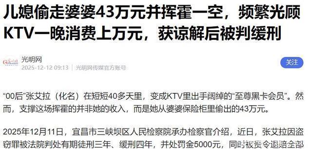 试想,丈夫不也缺少陪伴吗?他如果因为缺少陪伴不将钱给妻子,而将钱花给外面的女人,又是怎样的场景呢?那他得被骂上热搜多少天?媒体都是另一副嘴脸了。 当然,比起那件事,最近的另一件事也是如此,就是儿媳偷走婆婆43万元并挥霍一空,频繁光顾KTV一晚消费上万元的案件,媒体这样说。