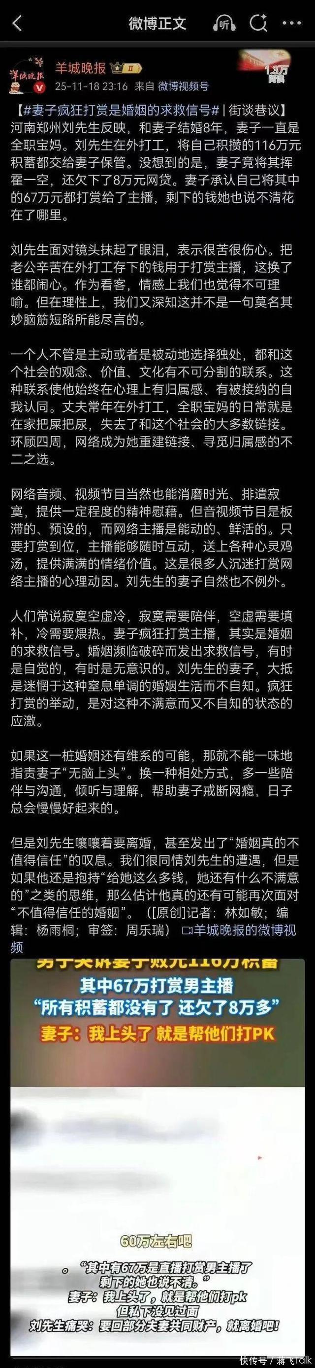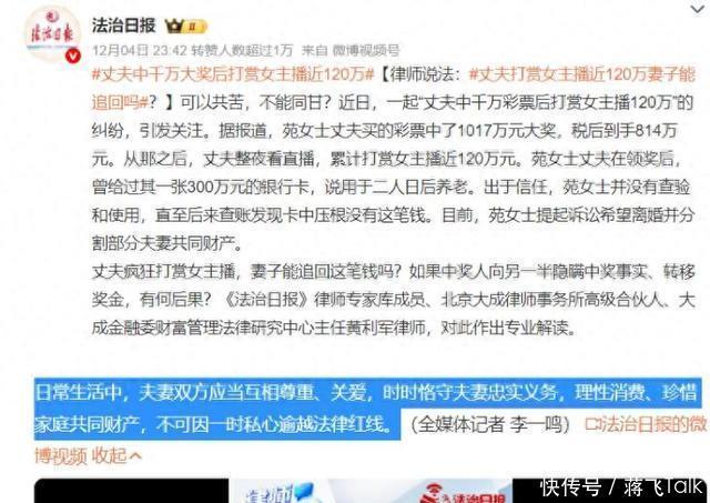 近期,丈夫中千万大奖后疯狂打赏女主播的事引发了热议,看媒体怎么说,首先以不能同甘不能共苦定性指责丈夫。